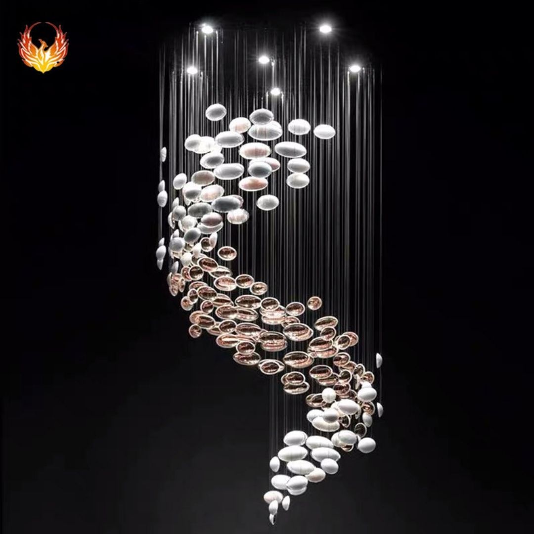 Đèn thả thông tầng quả trứng với thiết kế xoắn ốc mang đến cảm giác mềm mại và chuyển động trong không gian. Những quả trứng thủy tinh với hai màu trắng và vàng được sắp xếp đan xen khéo léo, tạo ra hiệu ứng thị giác độc đáo. Sự kết hợp hài hòa giữa các quả trứng và hình dáng xoắn ốc không chỉ làm tăng tính thẩm mỹ mà còn giúp ánh sáng phân bổ đều khắp không gian. Đây là mẫu đèn lý tưởng cho các không gian cao và rộng, nơi nó có thể phát huy hết vẻ đẹp và sự sang trọng.