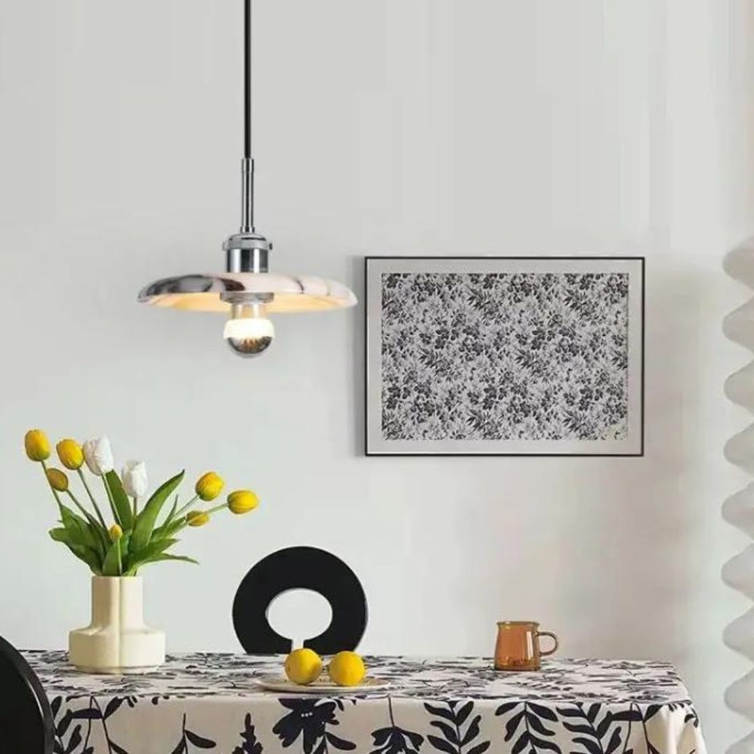 Phần khung kim loại mạ bóng màu bạc hiện đại, kết hợp cùng dây treo đen tinh giản, mang đến cảm giác chắc chắn và thanh lịch. Phần chao đá marble được mài nhẵn, tạo hiệu ứng ánh sáng dịu dàng khi đèn bật sáng. Đặc biệt, ánh sáng vàng ấm khi phản chiếu qua đá marble sẽ lan tỏa một cách nhẹ nhàng, không chói mắt, mang đến bầu không khí ấm áp và gần gũi.