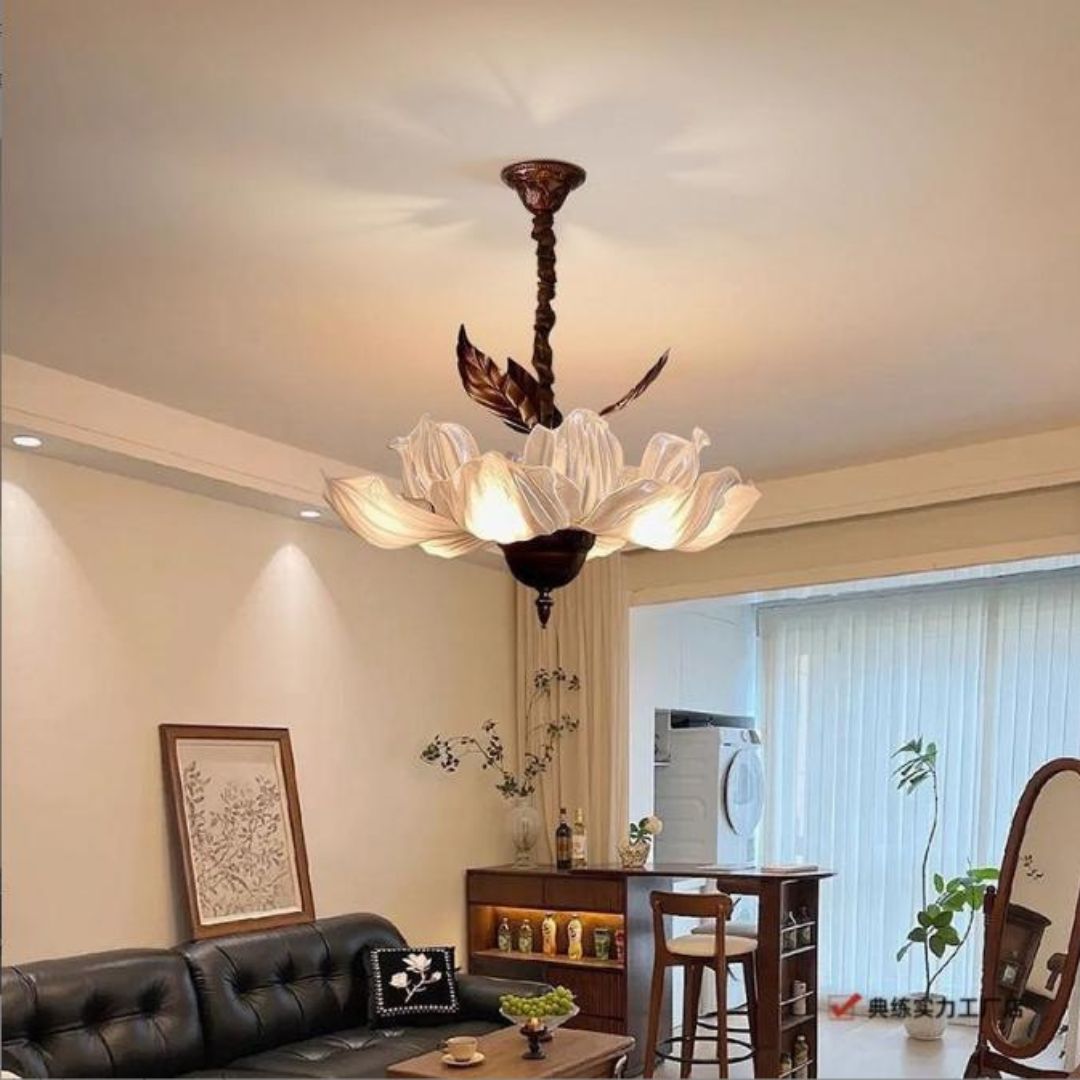 Trong phòng khách, đèn thả trần hoa cánh xếp đóng vai trò là điểm nhấn trung tâm, thu hút ánh nhìn ngay khi bước vào không gian. Thiết kế hoa nghệ thuật kết hợp ánh sáng dịu nhẹ giúp phòng khách trở nên sang trọng, ấm cúng và có chiều sâu hơn. Khi treo tại khu vực bàn trà hoặc giữa phòng, đèn thể hiện gu thẩm mỹ tinh tế của gia chủ. Mẫu đèn này đặc biệt phù hợp với phòng khách phong cách tân cổ điển, hiện đại sang trọng hoặc bán cổ điển.