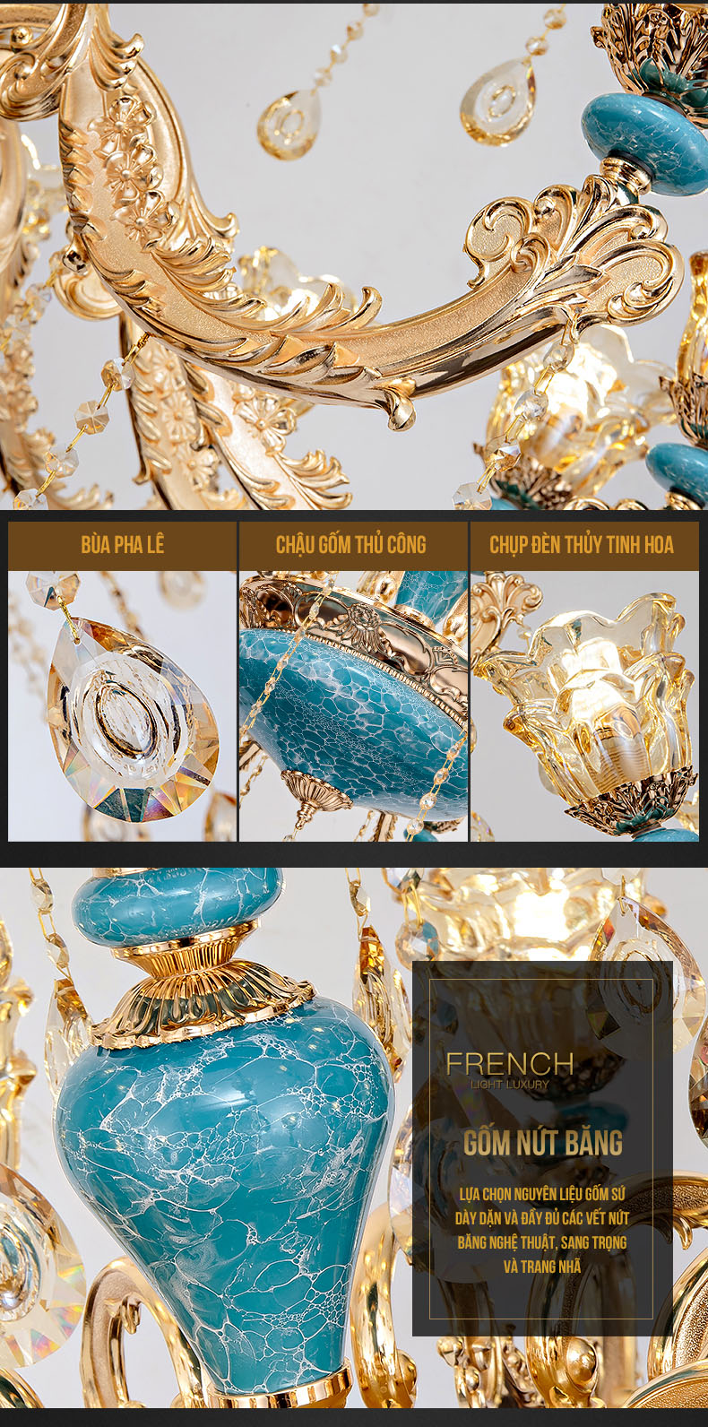 Đèn trần gốm màu lam sang trọng được thiết kế theo phong cách châu Âu, toát lên vẻ đẹp của sự tinh tế và cổ điển. Từng chi tiết trên đèn đều được chăm chút kỹ lưỡng, từ dây treo hợp kim titan bền bỉ cho đến phần chậu gốm thủ công với họa tiết băng nứt độc đáo. Sự kết hợp giữa các chất liệu cao cấp như gốm, pha lê, và thủy tinh mang lại vẻ đẹp hoàn mỹ, giúp không gian của bạn thêm phần quý phái và đẳng cấp.