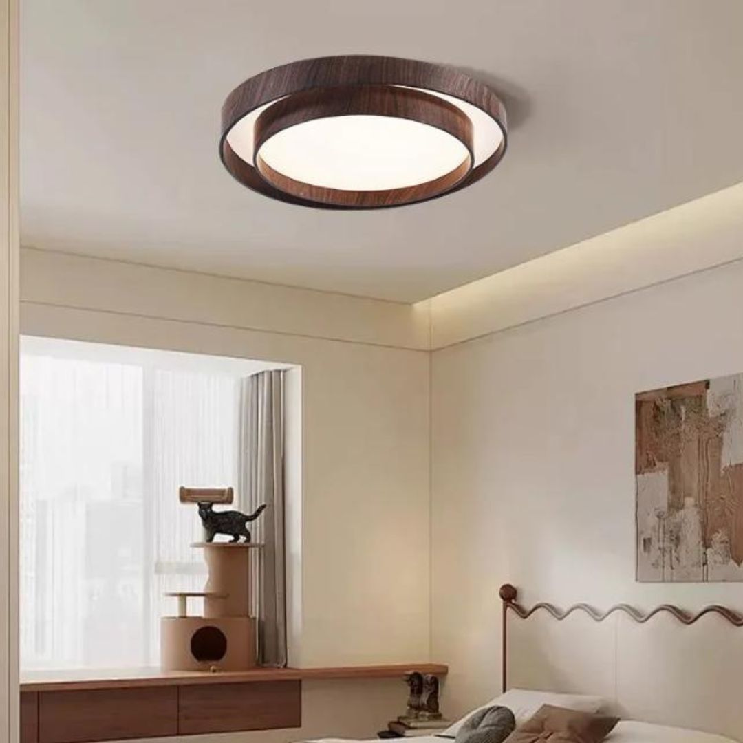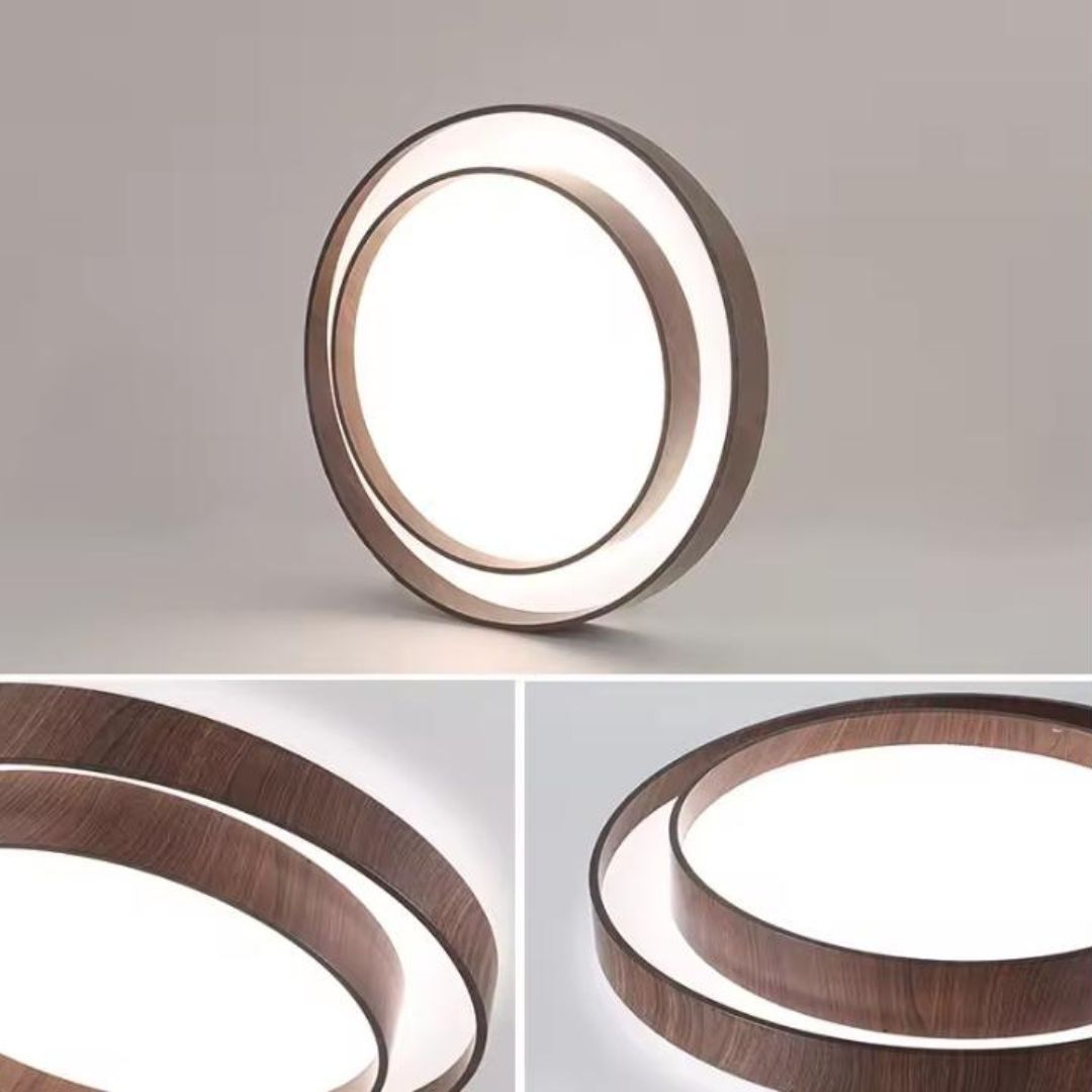 Mẫu đèn trần tròn viền sắt vân gỗ có cấu trúc độc đáo với hai vòng tròn đồng tâm, tạo nên một bố cục hài hòa và đầy tính nhịp điệu. Phần viền ngoài được thiết kế bằng chất liệu sắt sơn giả vân gỗ màu nâu óc chó, vừa mang lại cảm giác ấm áp vừa giữ được độ bền cao. Vòng trong cong nhẹ, ôm sát phần ánh sáng trung tâm, tạo chiều sâu và cảm giác ba chiều khi nhìn từ dưới lên.