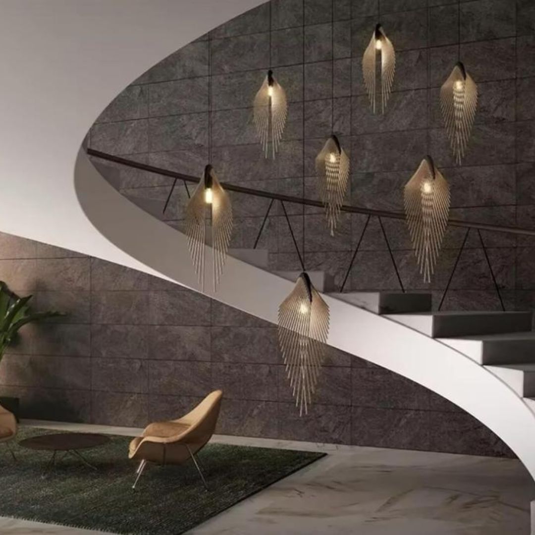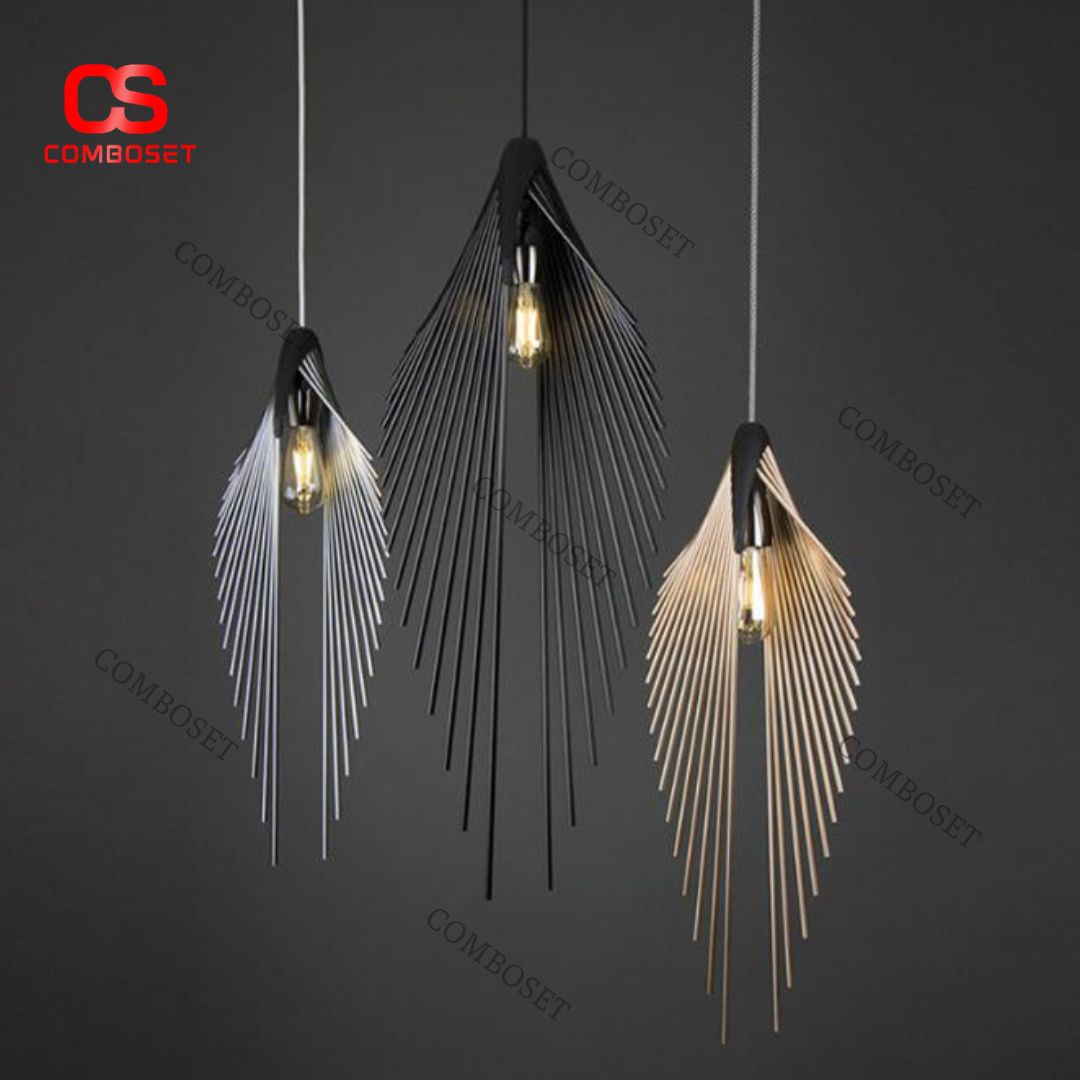 Mẫu đèn treo kim loại tia dài gây ấn tượng mạnh mẽ nhờ cấu trúc gồm hàng loạt các thanh kim loại thanh mảnh được sắp xếp theo hình vòng cung uốn lượn tinh tế. Thiết kế này mô phỏng hình ảnh của những chiếc lông vũ quyền năng hoặc những tia sáng đang lan tỏa từ một điểm trung tâm huyền bí. Sự sắp xếp đan xen giữa các tia dài ngắn khác nhau tạo nên hiệu ứng thị giác đa chiều, mang lại cảm giác chuyển động không ngừng ngay cả khi đèn đang ở trạng thái tĩnh, một vẻ đẹp đầy mê hoặc.