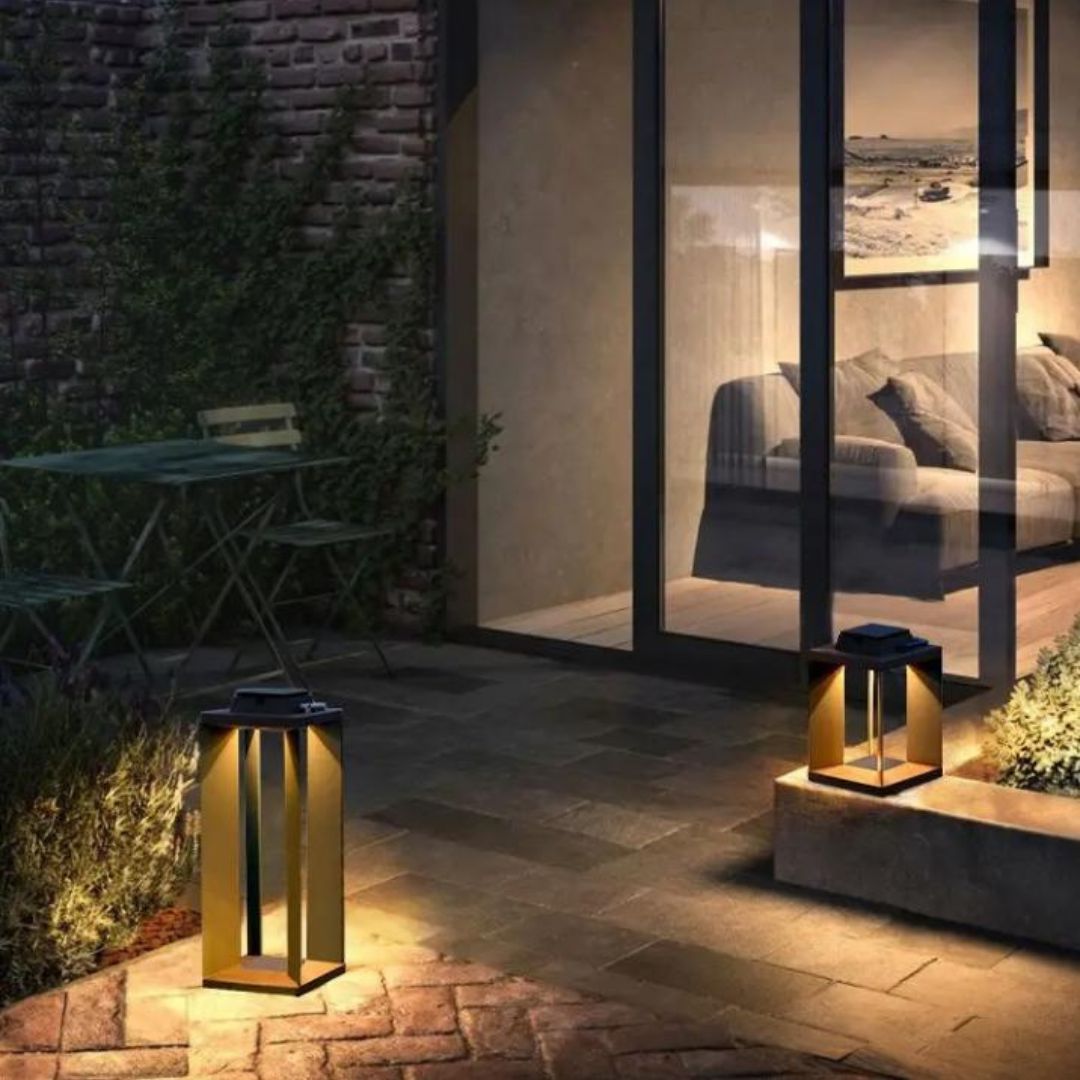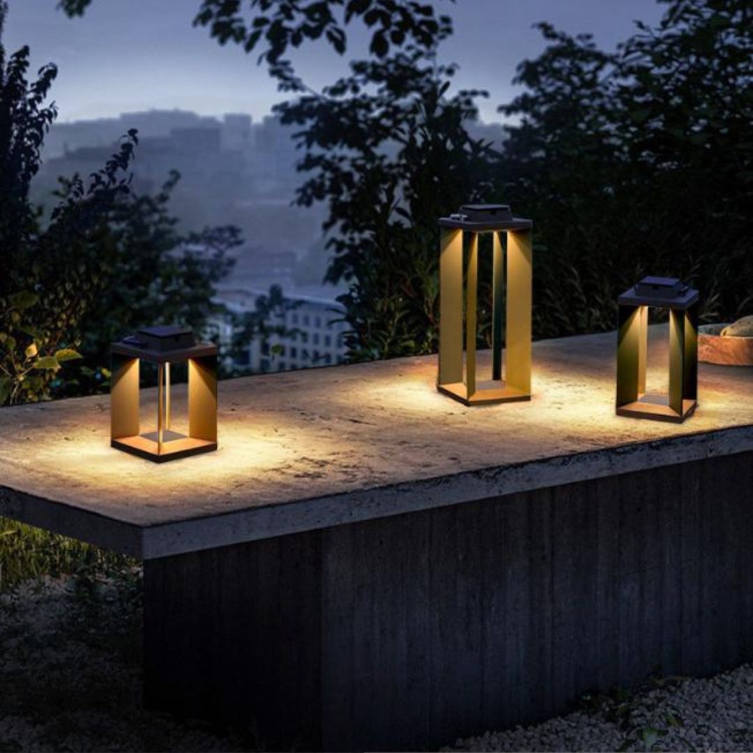 Đèn trụ vuông kim loại di động còn đóng vai trò như một vật phẩm trang trí ngoại thất đầy tinh tế. Ánh sáng vàng ấm dịu được khuếch tán từ đáy đèn tạo nên cảm giác thư giãn, gần gũi. Khi đặt tại các vị trí như dưới tán cây, cạnh ghế lười hay dọc lối đi sân vườn, ánh sáng phản chiếu nhẹ nhàng trên bề mặt gỗ hoặc đá giúp không gian trở nên lung linh, đầy tính nghệ thuật – đặc biệt là vào ban đêm, khi mỗi điểm sáng trở thành một điểm nhấn thu hút ánh nhìn.