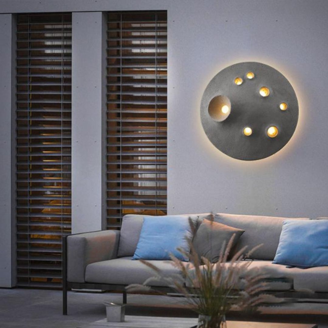 Bên trên bề mặt tròn là những điểm sáng nhỏ được bố trí bất đối xứng, gợi liên tưởng đến các vì sao xoay quanh mặt trăng. Cách sắp đặt này khiến đèn tường ánh trăng không chỉ là thiết bị chiếu sáng mà còn giống một bức tranh ánh sáng treo tường. Mỗi khi đèn bật lên, tổng thể trở nên sống động, có chiều sâu và mang hơi thở của nghệ thuật sắp đặt hiện đại.