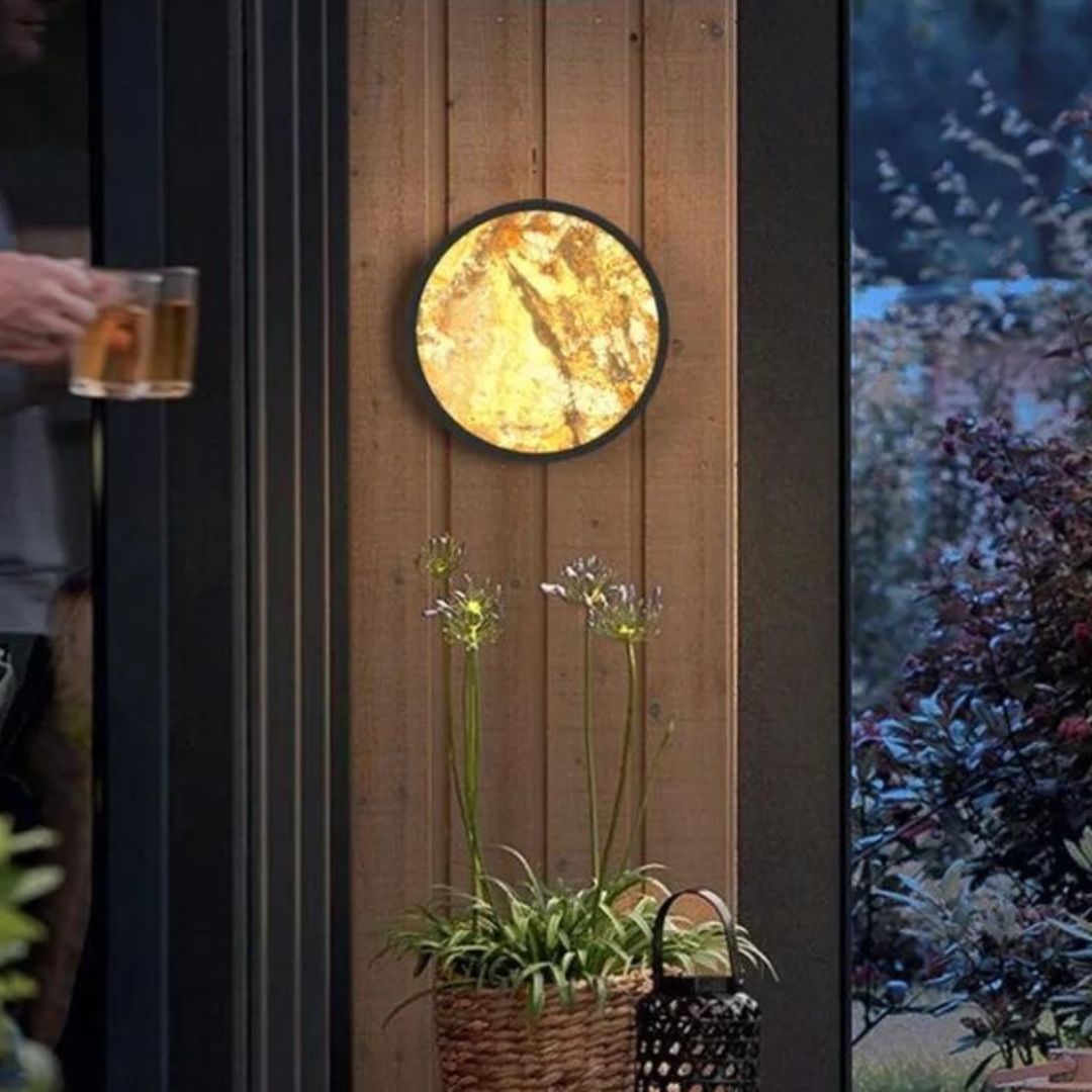 Quan sát hình ảnh, có thể thấy đèn tường phiến đá sở hữu thiết kế hình tròn cân đối, gắn trực tiếp lên bề mặt tường gạch. Phần khung kim loại bao quanh mặt đá tạo đường viền rõ ràng, giúp tổng thể đèn trở nên gọn gàng và hiện đại. Kiểu dáng tròn mang lại cảm giác mềm mại, dễ kết hợp với nhiều phong cách kiến trúc khác nhau, từ tối giản đến nghệ thuật.
