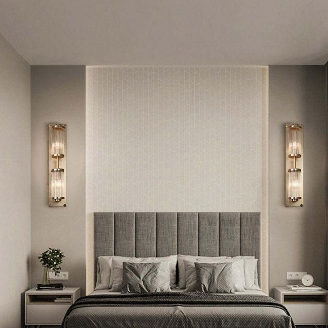 Trong phòng ngủ master, đèn tường trụ đôi thủy tinh sọc mang đến cảm giác thư giãn và ấm áp. Khi lắp hai bên đầu giường hoặc trên mảng tường trang trí, đèn tạo ánh sáng nền nhẹ nhàng, rất phù hợp cho không gian nghỉ ngơi. Thiết kế trụ đứng thanh mảnh giúp đèn không chiếm nhiều diện tích, đồng thời tạo sự cân đối cho bố cục phòng ngủ. Ánh sáng dịu giúp gia chủ dễ dàng thư giãn, đọc sách hoặc nghỉ ngơi mà không gây mỏi mắt.