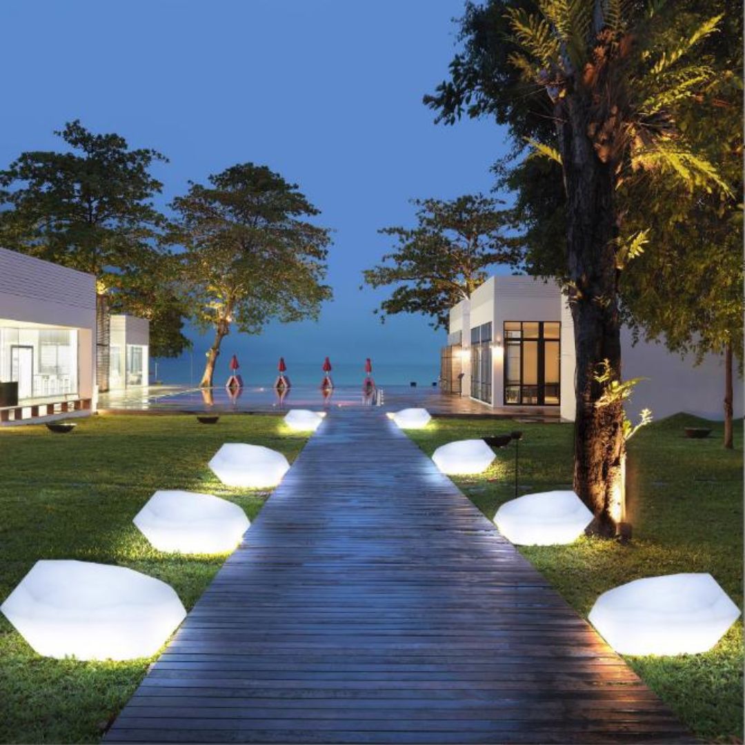 Khi được đặt xen kẽ giữa thảm cỏ, lối đi hoặc gốc cây, đèn viên đá LED đổi màu tạo nên hiệu ứng ánh sáng tự nhiên, giúp khu vườn như bừng sáng trong đêm. Mỗi viên đá là một điểm nhấn lung linh, giúp không gian trở nên lãng mạn và yên bình. Đặt quanh hồ bơi hoặc khu vực spa, ánh sáng của đèn viên đá LED đổi màu phản chiếu trên mặt nước, tạo nên không gian sang trọng và thư giãn tuyệt đối. Đây cũng là xu hướng thiết kế phổ biến tại các resort 5 sao, khách sạn và villa nghỉ dưỡng.
