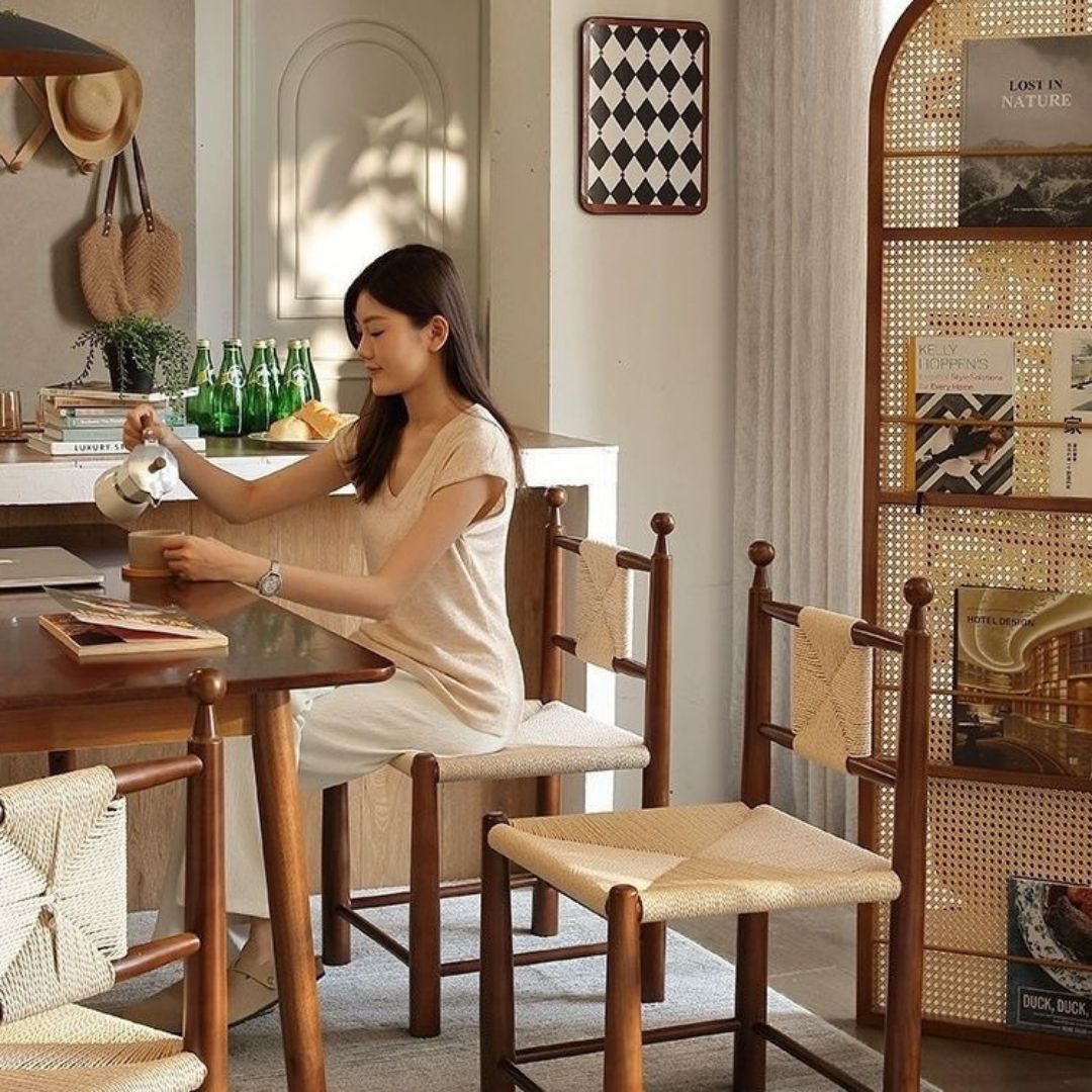 Nhìn vào tổng thể, chiếc ghế ăn dây đan mang đến cảm giác mộc mạc, gần gũi, gợi lại tinh thần thủ công truyền thống nhưng vẫn phù hợp với không gian sống hiện đại. Dáng ghế gọn gàng, cấu trúc rõ ràng, từng chi tiết đều hướng đến trải nghiệm ngồi tự nhiên và thoải mái.