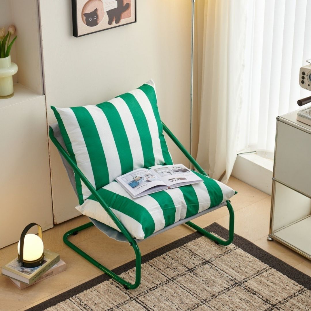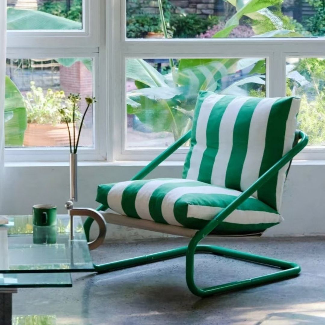 Về mặt thẩm mỹ, sự kết hợp giữa khung kim loại màu xanh bảo lục và đệm vải kẻ sọc trắng – xanh giúp nổi bật nhưng không rối mắt. Màu sắc mang hơi hướng trẻ trung, hiện đại, rất phù hợp với không gian sống năng động, sáng tạo hoặc những căn hộ yêu thích điểm nhấn màu sắc.