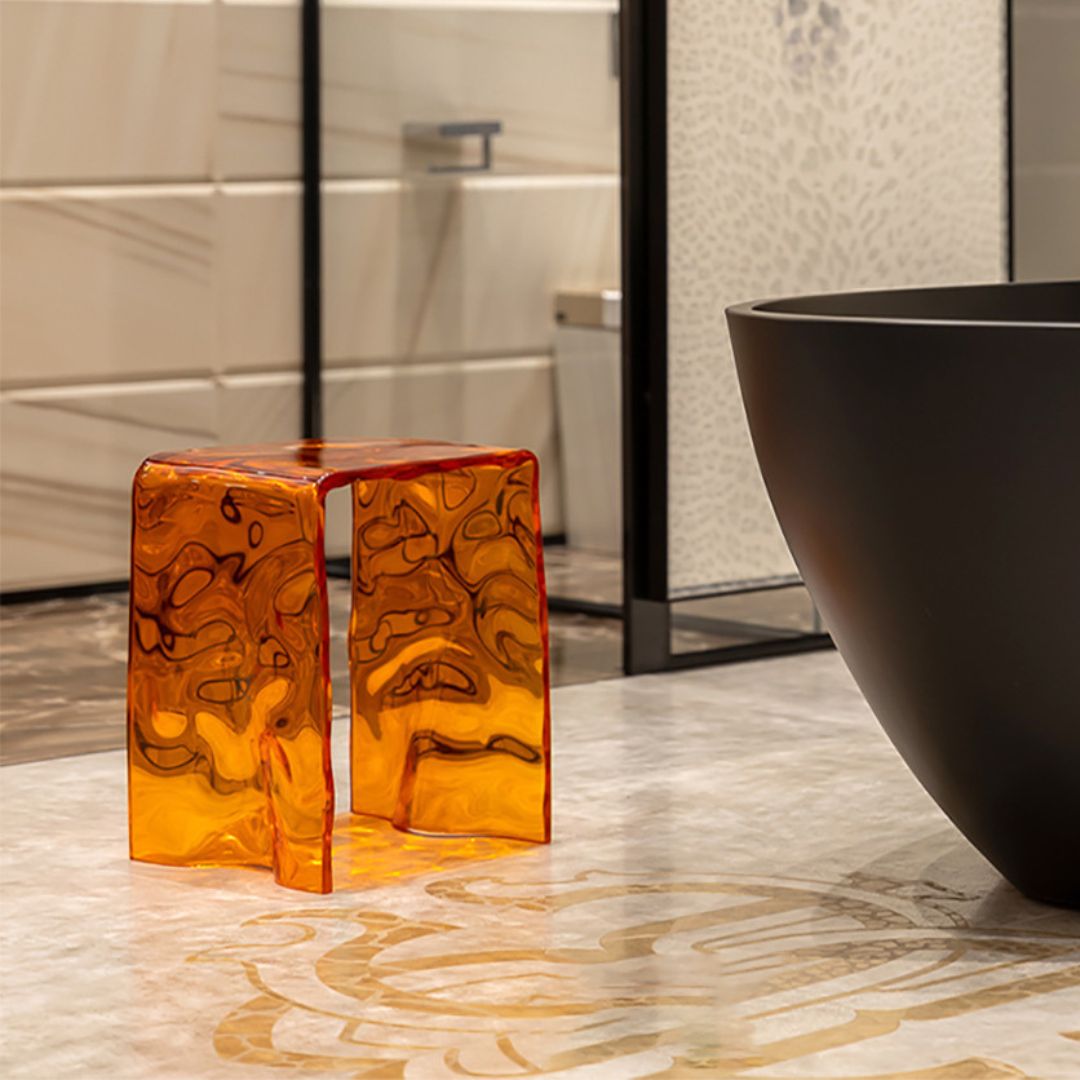 Bề mặt ghế có hiệu ứng gợn sóng tự nhiên, phản chiếu ánh sáng tạo nên sắc độ chuyển màu cam hổ phách rực rỡ, giống như ánh hoàng hôn xuyên qua lớp kính trong. Đây chính là điểm làm nên sự khác biệt nổi bật của ghế đẩu cầu vồng gợn sóng, khiến sản phẩm không chỉ là một chiếc ghế mà còn là một tác phẩm trang trí.