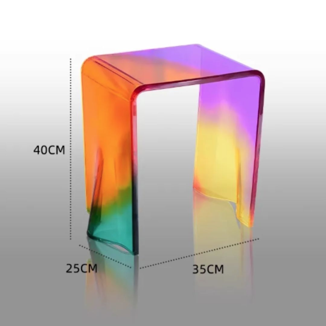 Phần chân của ghế đẩu cầu vồng gợn sóng được tạo thành từ hai tấm uốn cong liền khối, rủ xuống từ mặt ghế một cách tự nhiên như dòng thác mềm. Không có khung kim loại hay chân rời ghép nối, toàn bộ thân ghế được đúc nguyên khối từ chất liệu nhựa acrylic cao cấp hoặc resin trong suốt dày dặn, tạo độ bền cao và khả năng chịu lực tốt.