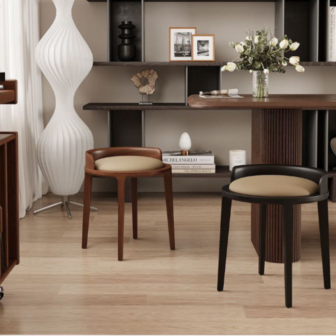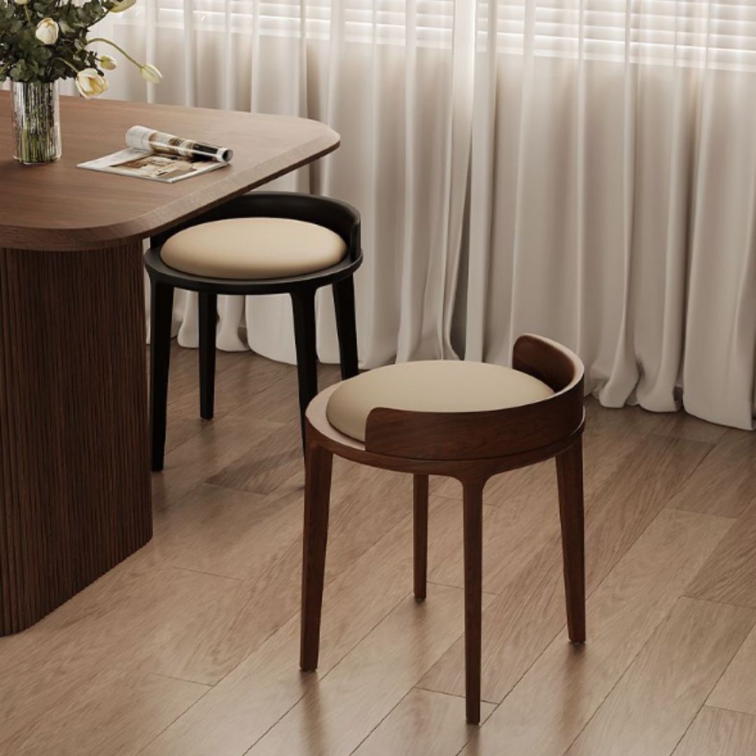 Mẫu ghế đẩu đệm tròn sở hữu thiết kế dáng thấp, phần ngồi hình tròn đầy đặn, kết hợp cùng tựa lưng cong nhẹ ôm sát cơ thể. Tổng thể ghế mang phong cách tối giản nhưng tinh tế, phù hợp với nhiều kiểu không gian từ hiện đại, Bắc Âu đến Japandi hoặc nội thất gỗ truyền thống.