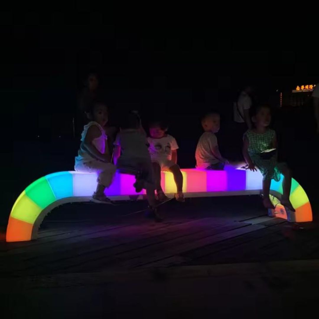 Ở hình thực tế, ghế phát sáng theo dạng mảng màu chuyển tiếp gồm đỏ, xanh lá, vàng, xanh dương, tím, hồng… tạo nên dải màu hiệu ứng tương tự cầu vồng. Ánh sáng không chỉ phủ đều trên bề mặt mà còn cực kỳ nổi bật trong môi trường tối, rất phù hợp cho công viên hoặc khu vực đông người qua lại.