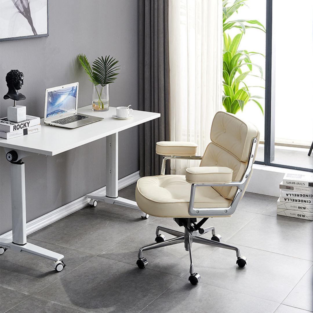 Về mặt thẩm mỹ, ghế phòng sách bằng da sở hữu kiểu dáng hiện đại, tinh giản nhưng vẫn toát lên vẻ sang trọng. Ghế dễ dàng kết hợp với nhiều phong cách nội thất khác nhau, từ phòng sách cổ điển đến không gian hiện đại, tối giản. Sự hiện diện của ghế phòng sách bằng da giúp không gian trở nên gọn gàng, chuyên nghiệp và có chiều sâu hơn.