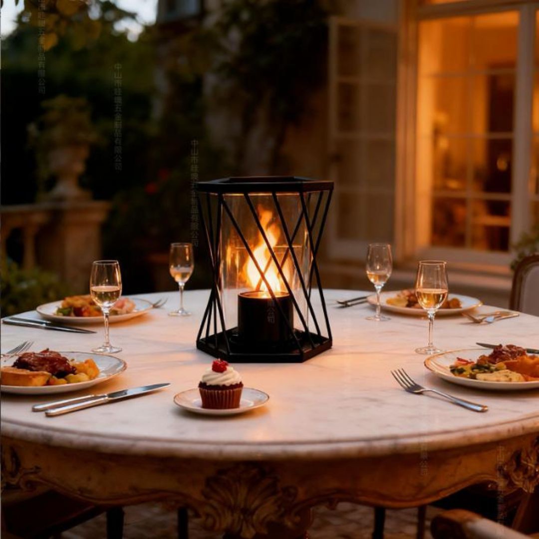 Lò sưởi khung thanh chéo kích thước nhỏ cũng rất phù hợp để đặt trên bàn ăn hoặc bàn tiệc. Ánh lửa nhẹ nhàng giúp bữa ăn trở nên ấm áp và có cảm xúc hơn, đặc biệt trong các buổi tối hoặc dịp tụ họp gia đình. Thiết kế gọn gàng giúp lò không chiếm nhiều diện tích mặt bàn, vẫn đảm bảo sự tiện lợi khi sử dụng. Đây là chi tiết decor được nhiều người lựa chọn để nâng tầm không gian bàn tiệc mà không cần quá nhiều phụ kiện.