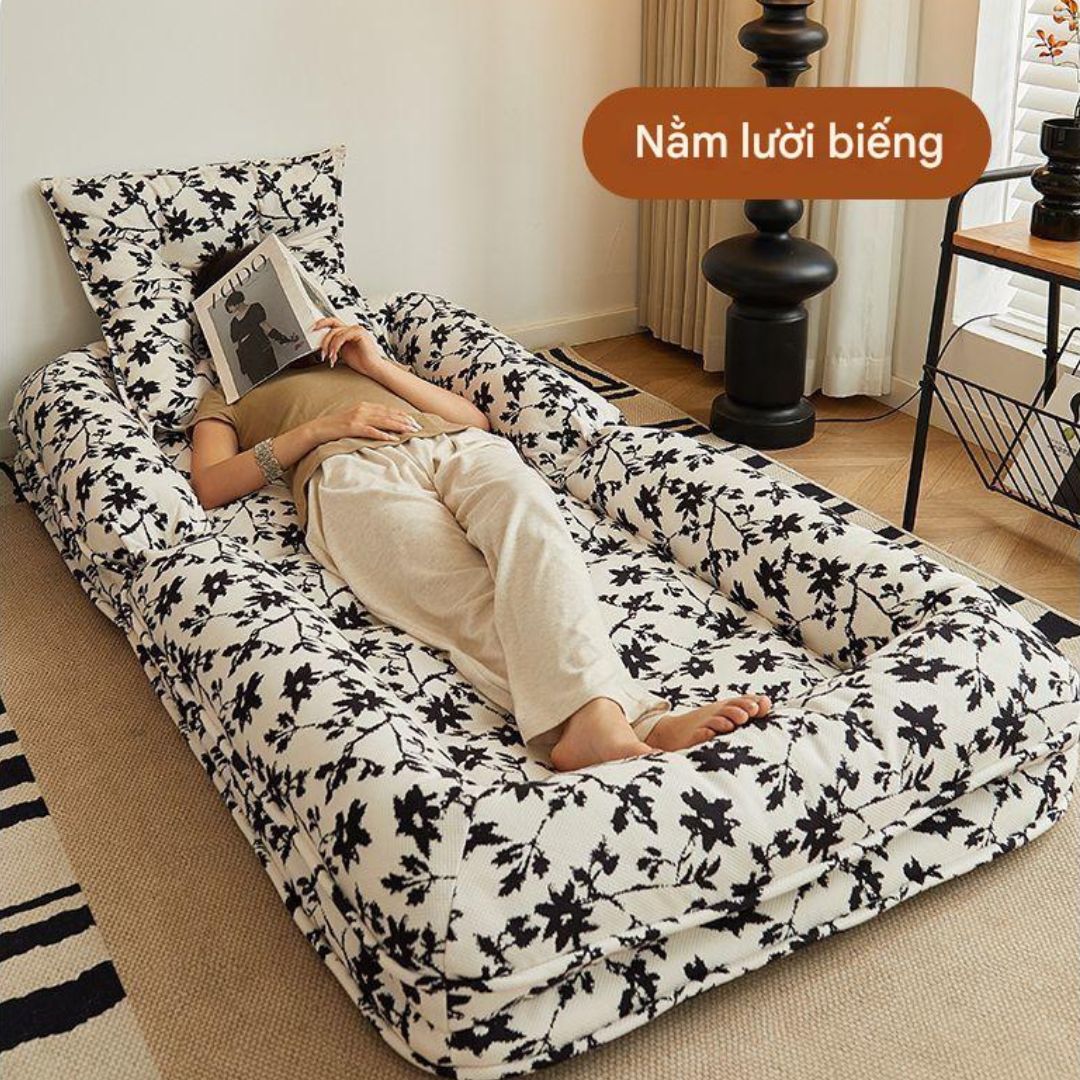 Sản phẩm cho thấy một mẫu thảm tatami đa năng, có thể trải phẳng để nằm nghỉ hoặc dựng lưng thành ghế tựa cực kỳ tiện lợi. Thiết kế mềm mại, họa tiết hoa lá đen trắng nổi bật trên nền sáng giúp thảm tatami không chỉ là vật dụng thư giãn mà còn là điểm nhấn trang trí tinh tế cho không gian sống.